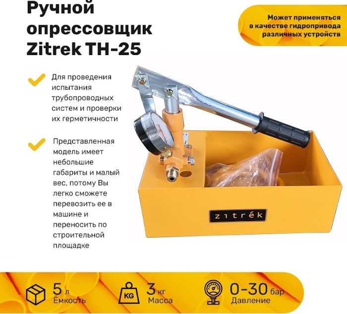 Ручной опрессовщик Zitrek TH-25 (5 л., 0-30 атм., 3кг)