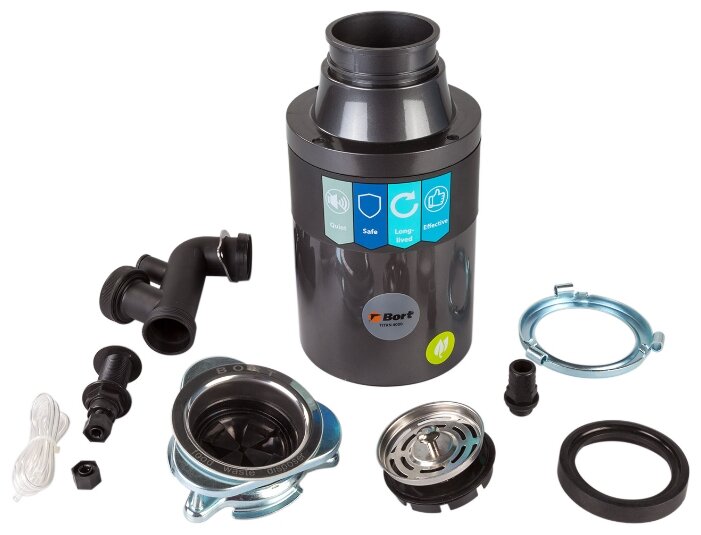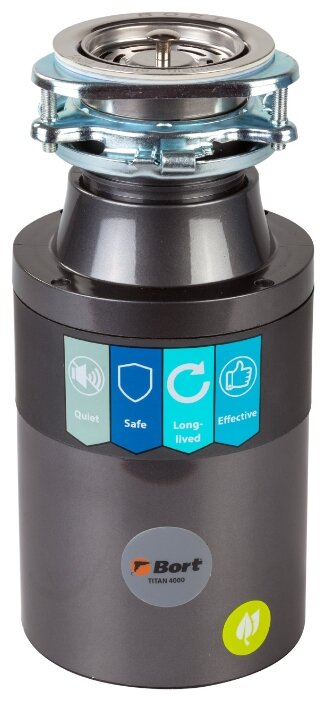 Измельчитель пищевых отходов Bort TITAN 4000 − это полезное приспособление в хозяйстве, которое позволит не так часто выносить пакеты с мусором. Прибор высотой 364 мм предназначен для измельчения испорченной пищи, остатков продуктов и всего того, что вы выбрасываете в мусорный пакет, испытывая дискомфорт от запахов. Благодаря невысокому уровню вибрации устройство можно устанавливать на абсолютно любые раковины. При монтаже следует учитывать толщину мойки в зоне отверстия для слива: толщина не должна быть более 18 мм.