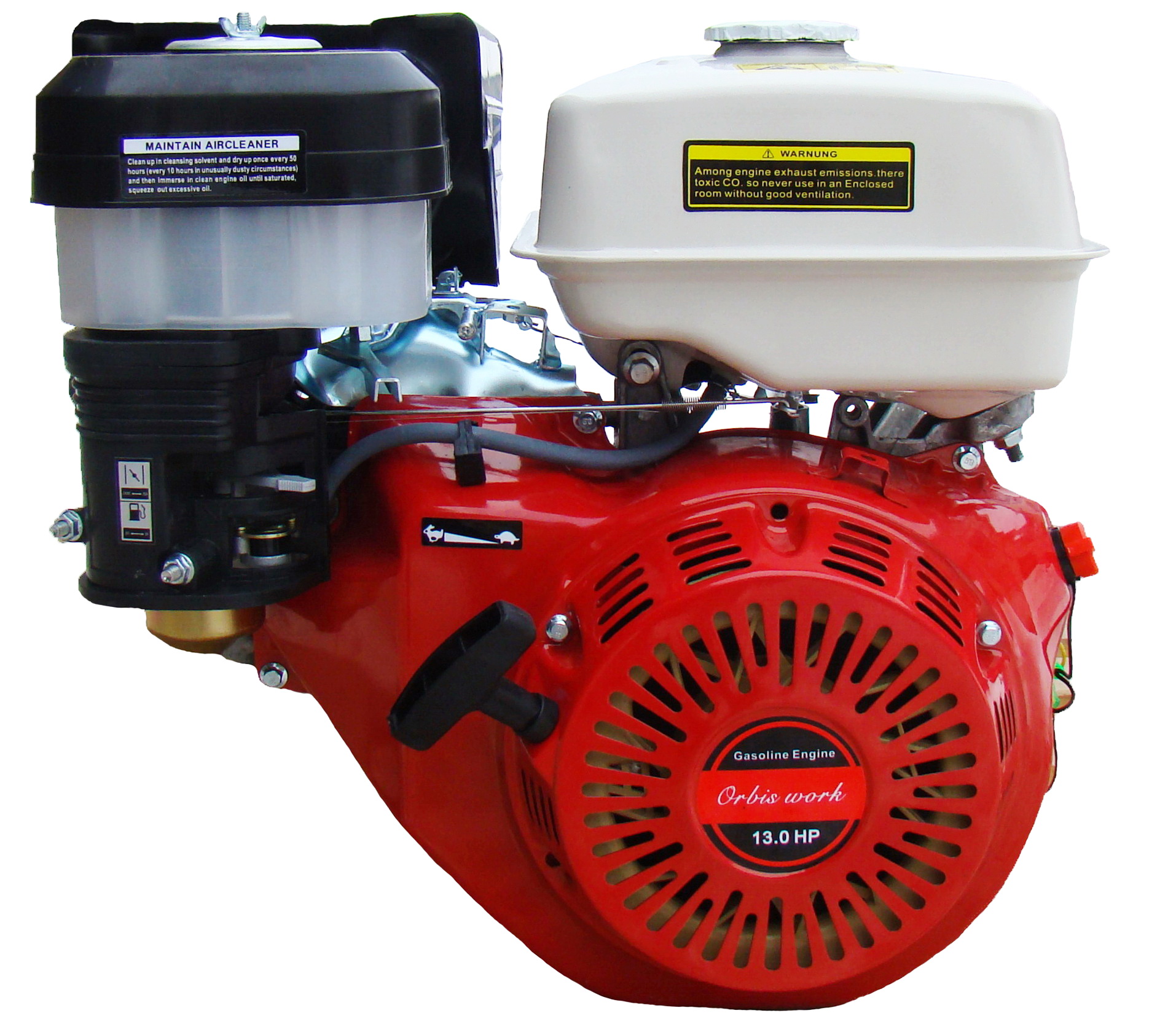 Одноцилиндровый двигатель имеет верхний тип расположения клапанов, что помогает ему более продуктивно применять топливо. В целях недопущения перегрева модель оснащена системой воздушного охлаждения. Объём топливного бака располагает к проведению четырёхчасового рабочего цикла без сопутствующей дозаправки. Двигатель оснащён датчиком низкого уровня масла, поэтому пользователь имеет возможность вовремя исключить функционирование агрегата в опасном режиме. Мощность в 13 лошадиных сил предполагает использование изделия на самом разнообразном оборудовании, механизирующем труд человека.
