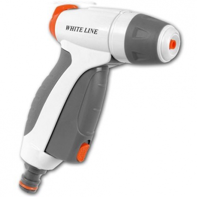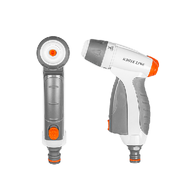 Металлический поливочный пистолет Bradas WL-EN51M серии WHITE LINE. Инновационная клавиша подачи воды с переключателем-фиксатором нажатого положения. Регулировка формы потока от широкого конуса до узкой струи или тумана. Регулятор напора воды в верхней части.