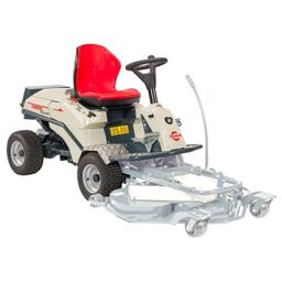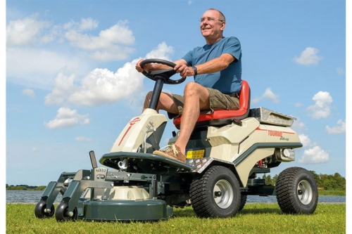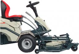 Режущая дека устанавливается впереди машины, что предоставляет оператору максимальный обзор обрабатываемой поверхности и позволяет стричь травяное покрытие даже под установленными скамейками.