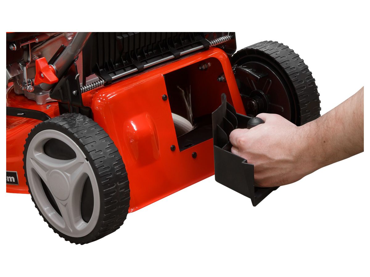 Травосборник снабжен индикатором заполнения и жестким пластиковым верхом, упрощающим его опорожнение.