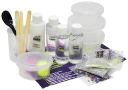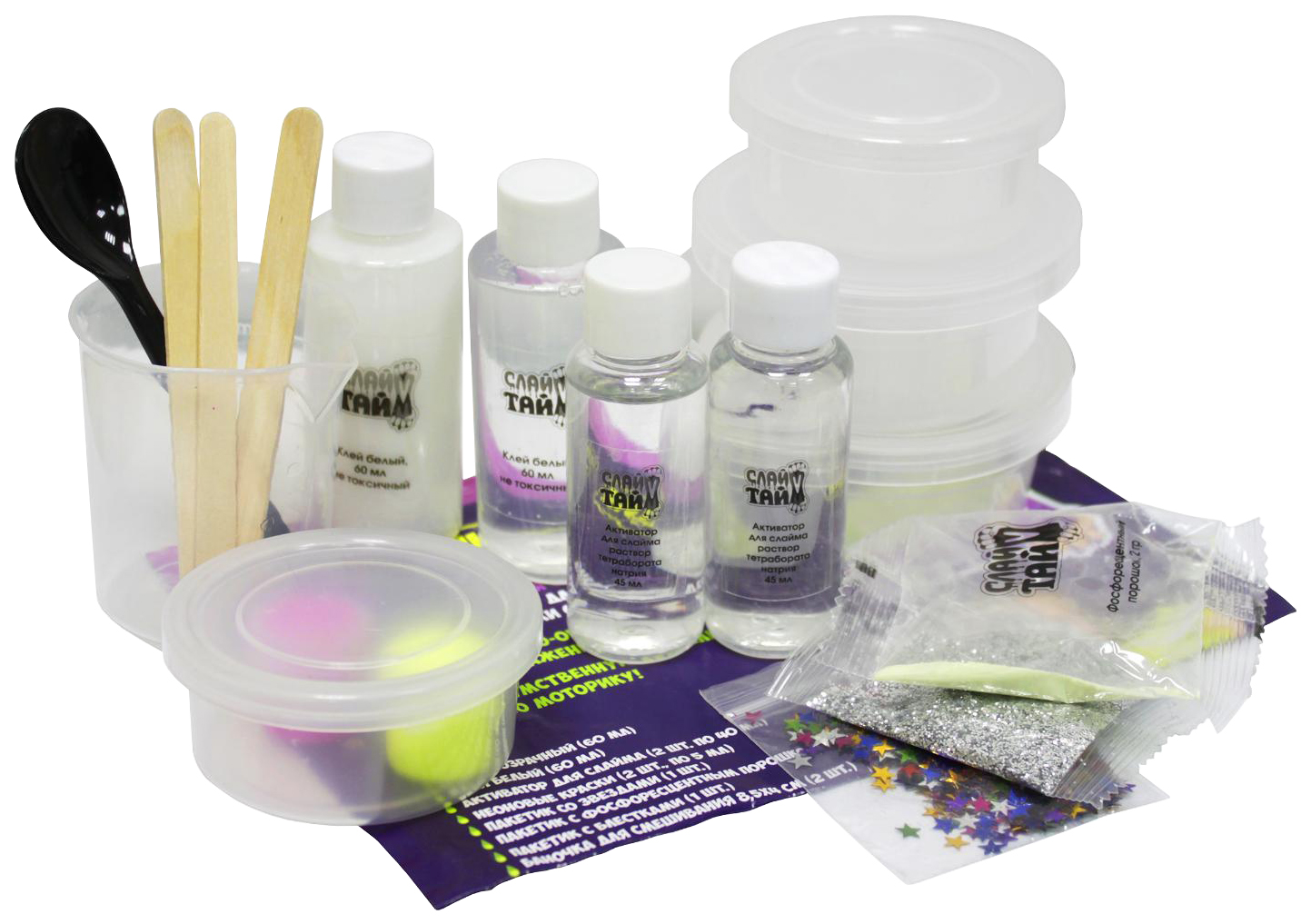 - Состав набора клей; активатор для слайма; баночки с неоновыми красками; пакетик с блестками; баночка; палочка для размешивания