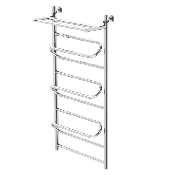 Изделие из нержавеющей стали подключается к системам горячего водоснабжения или центрального отопления. Оно выступает источником тепла для просушивания одежды, полотенец и других предметов бытового обихода. Модель имеет три перекладины и подключается с нижней части.