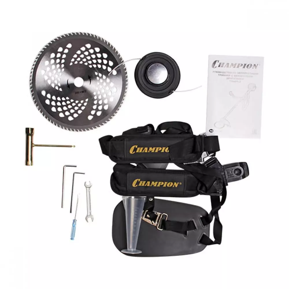Champion T394FS-2 - компактный бензиновый инструмент, пригодный для кошения мелкой травы и молодой поросли. Для снижения нагрузки на оператора задействован наплечный ремень и велосипедная рукоятка. В зависимости от решаемой задачи пользователь может установить катушку с леской или нож.