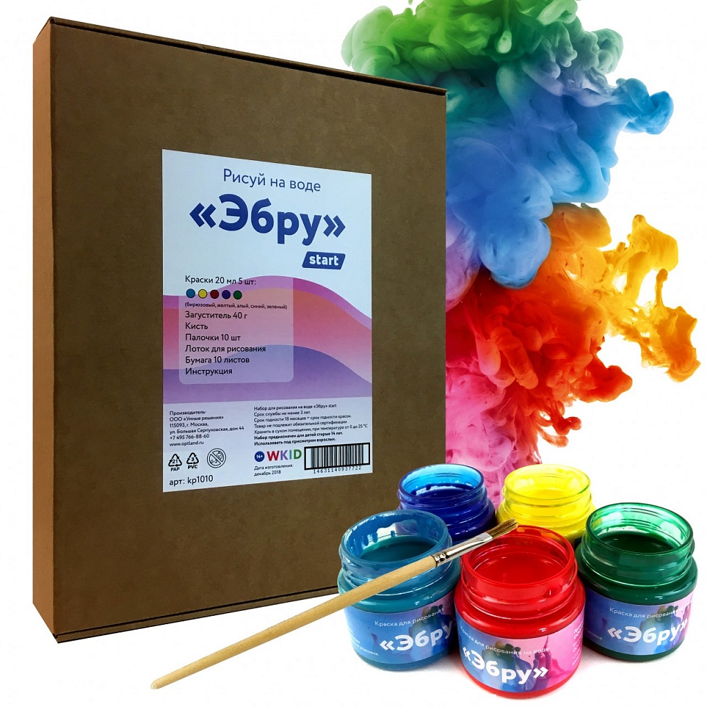 - Состав набора краски 20 мл. — 5 цветов (бирюзовый, жёлтый, красный, фиолетовый, зелёный)баночка с загустителем для раствора - 40 г. лоток для рисования - 1 шт.кисть - 1 шт.деревянные палочки для рисования - 10 шт.бумага для эбру - 10 листов, инструкция