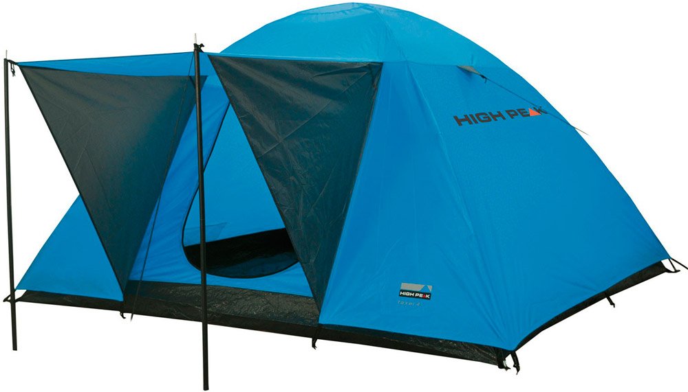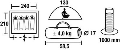 Палатка треккинговая; количество мест 4; количество входов 1; форма палатки полусфера; материал каркаса стеклопластик; водостойкость тента 1000 мм вод; ст; вентиляционные клапаны, антимоскитные сетки, проклеенные швы; вес комплекта 4 кг; высота 130 см.
