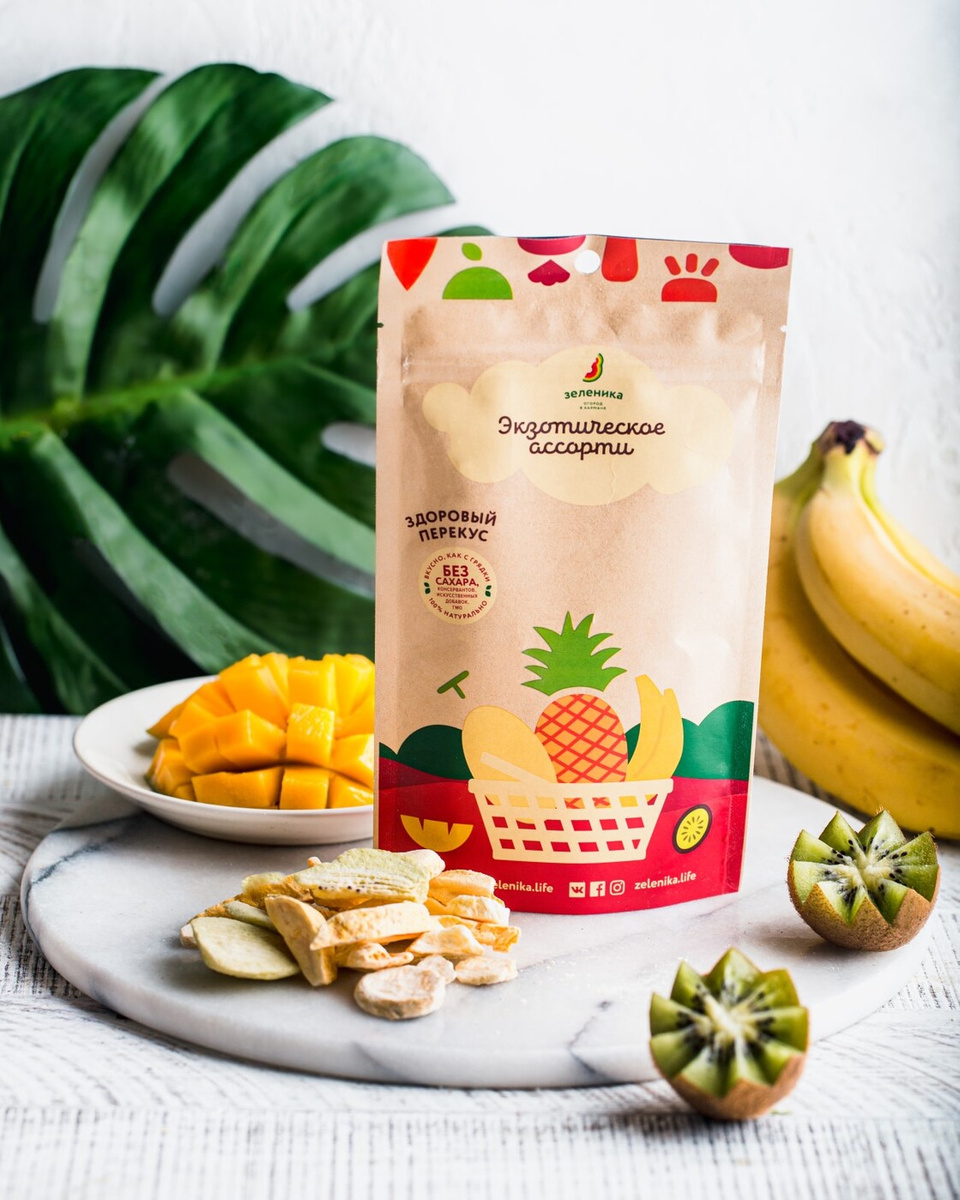 - Состав: киви сушёное, манго сушёное, ананас сушёный, банан сушёный, дыня сушёная