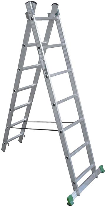 Алюминиевая лестница-трансформер с рифлеными ступенями может быть использована как приставная лестница и как лестница стремянка. Нижняя часть лестницы снабжена стабилизатором шириной 90 см для лучшей устойчивости. Количество перекладин: 2x12. Максимальная нагрузка: 150 кг. Вес 14.7 кг.