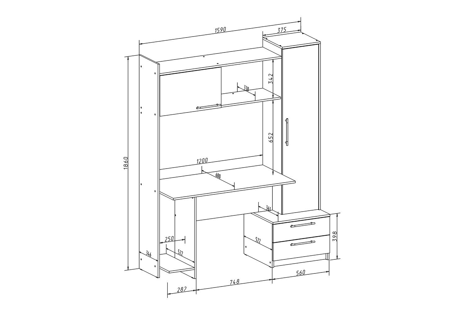 - Размеры (ШхГхВ), в сантиметрах 159х60х186