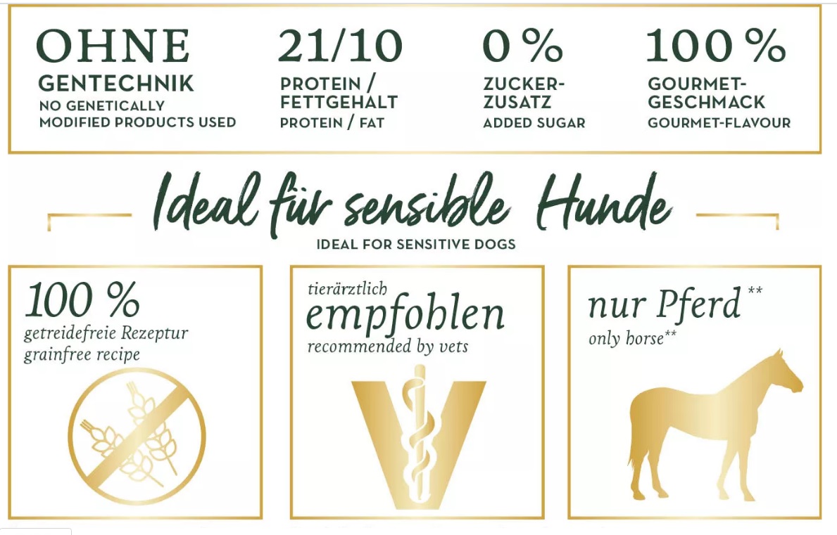 - Ингредиенты конина - 17,5 %, картофель, картофельный белок, подсолнечное масло, свекольная пульпа (без сахара), гидролизат печени, рапсовое масло, яблочная пульпа, хлорид натрия, дрожжи