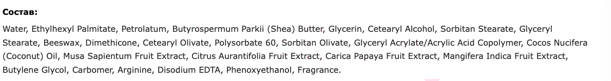 - Состав Water, Ethylhexyl Palmitate, Petrolatum, Butyrospermum Parkii (Shea) Butter, Glycerin, Cetearyl Alcohol, Sorbitan Stearate, Glyceryl Stearate, Beeswax, Dimethicone, Cetearyl Olivate, Polysorbate 60, Sorbitan Olivate