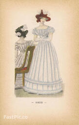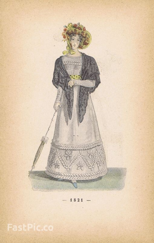 Гравюра. Женская (дамская) мода 1821-1822 гг. Дневные платья и ажурная шаль. Двухсторонняя хромогравюра. Франция, Париж, 1896 год
