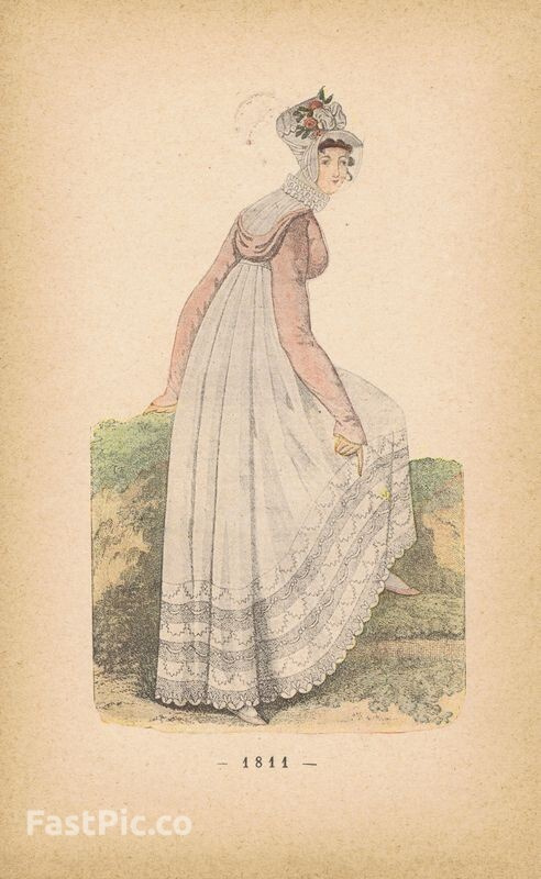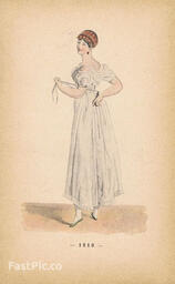 Гравюра. Женская (дамская) мода 1810-1811 гг. Летнее платье и костюм. Двухсторонняя хромогравюра. Франция, Париж, 1896 год