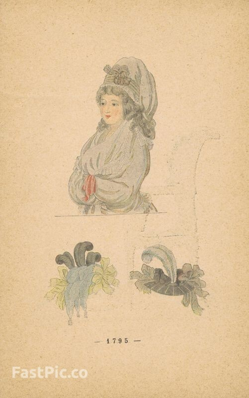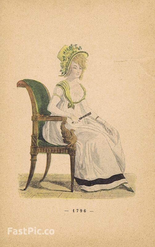 Гравюра. Женская (дамская) мода 1795-1796 гг. Домашняя одежда и головные уборы. Двухсторонняя хромогравюра. Франция, Париж, 1896 год