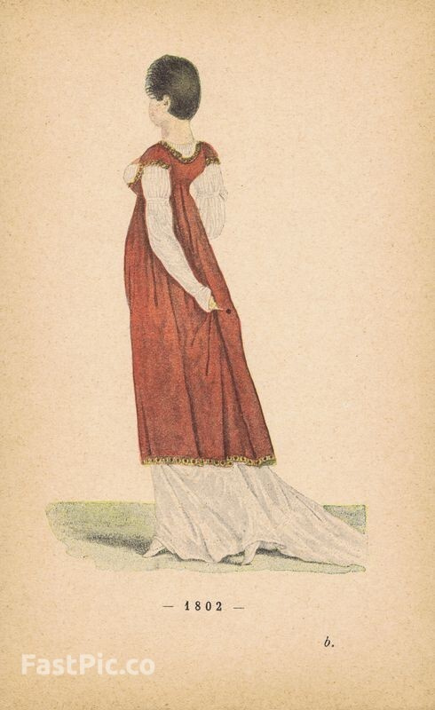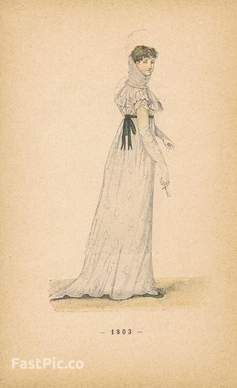 Гравюра. Женская (дамская) мода 1802-1803 гг. Легкое белое платье и костюм. Двухсторонняя хромогравюра. Франция, Париж, 1896 год
