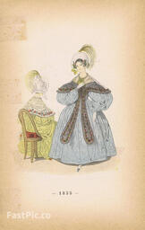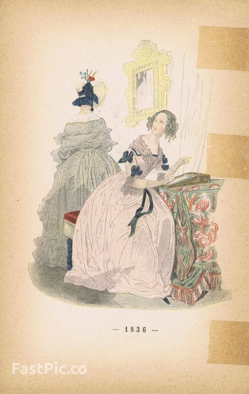 Гравюра. Женская (дамская) мода 1835-1836 гг. Домашние платья и костюмы для прогулок. Двухсторонняя хромогравюра. Франция, Париж, 1896 год
