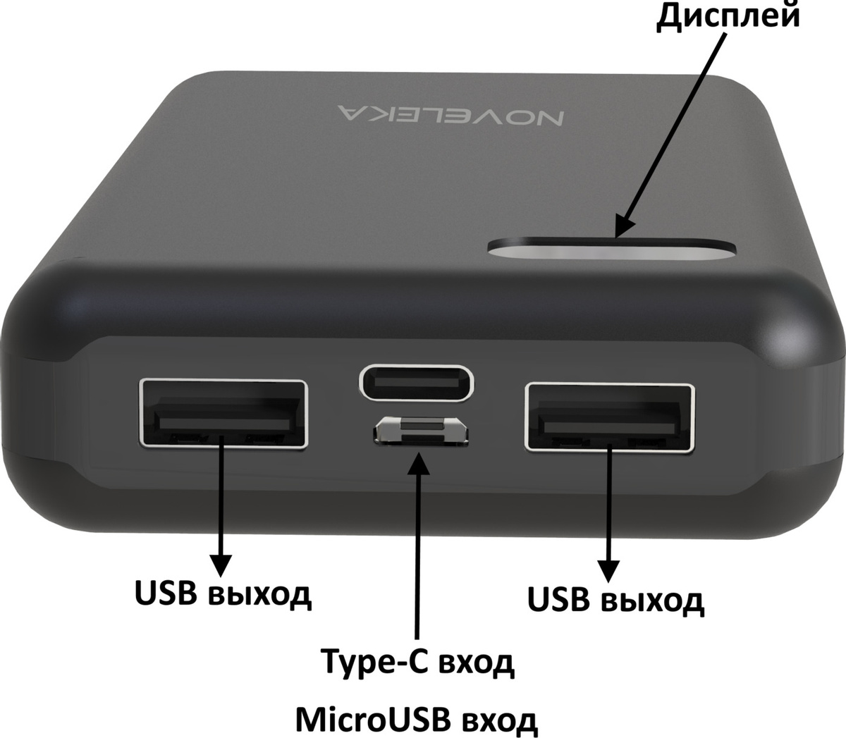 - Особенности Дисплей, Зарядка двух устройств, Индикатор емкости