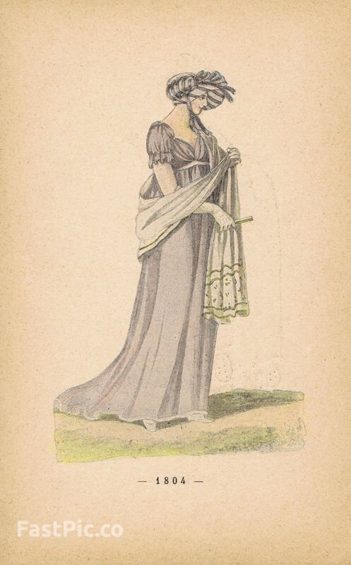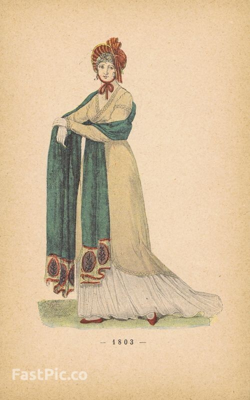 Гравюра. Женская (дамская) мода 1803-1804 гг. Платья, палантины и элегантные шляпки. Двухсторонняя хромогравюра. Франция, Париж, 1896 год