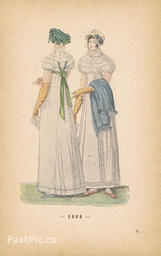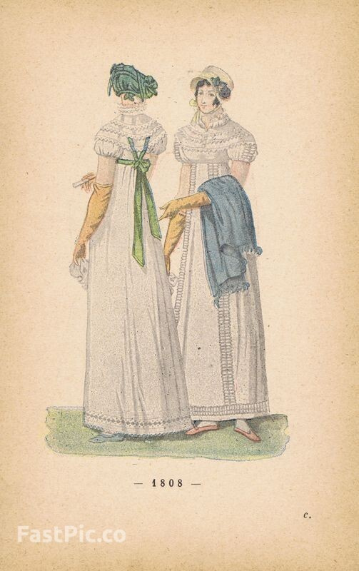 Гравюра. Женская (дамская) мода 1808-1809 гг. Кружевные платья, костюм для прогулок и яркая шаль. Двухсторонняя хромогравюра. Франция, Париж, 1896 год