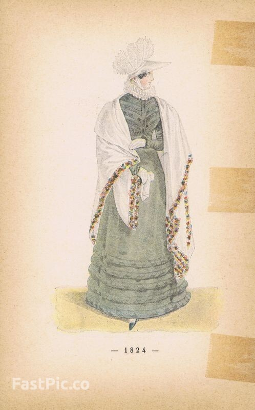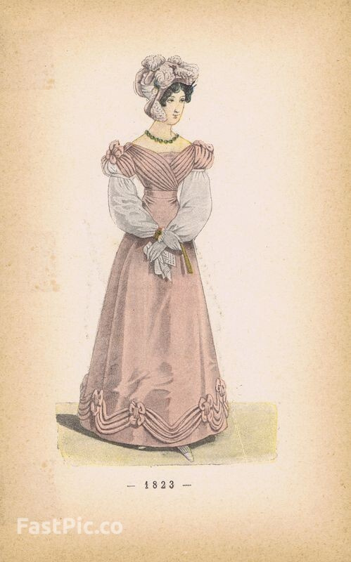 Гравюра. Женская (дамская) мода 1823-1824 гг. Розовое платье с пышными рукавами и повседневное платье с накидкой. Двухсторонняя хромогравюра. Франция, Париж, 1896 год