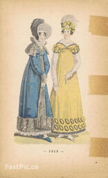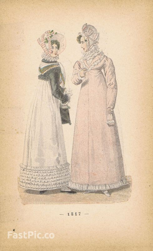 Гравюра. Женская (дамская) мода 1817-1818 гг. Платья и костюмы для прогулок, пальто с меховой отделкой. Двухсторонняя хромогравюра. Франция, Париж, 1896 год