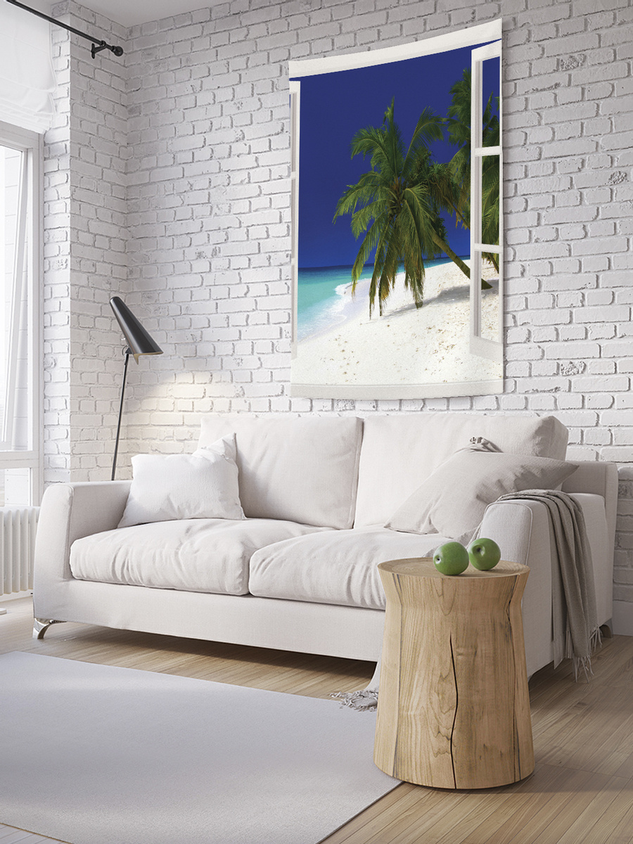 Панно (постер) с фотопринтом на стену "Пляж с пальмами за окном", 100x150 см