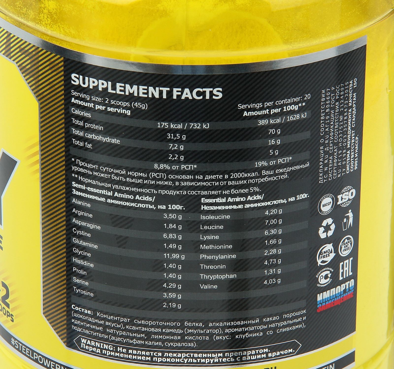 - Прочие ингредиенты, в порции алкализованный какао порошок (шоколадные вкусы), гуаровая камедь (эмульгатор), ароматизаторы натуральные и идентичные натуральным, лимонная кислота (вкус: клубника со сливками), подсластители (ацесульфам калия, сукралоза)