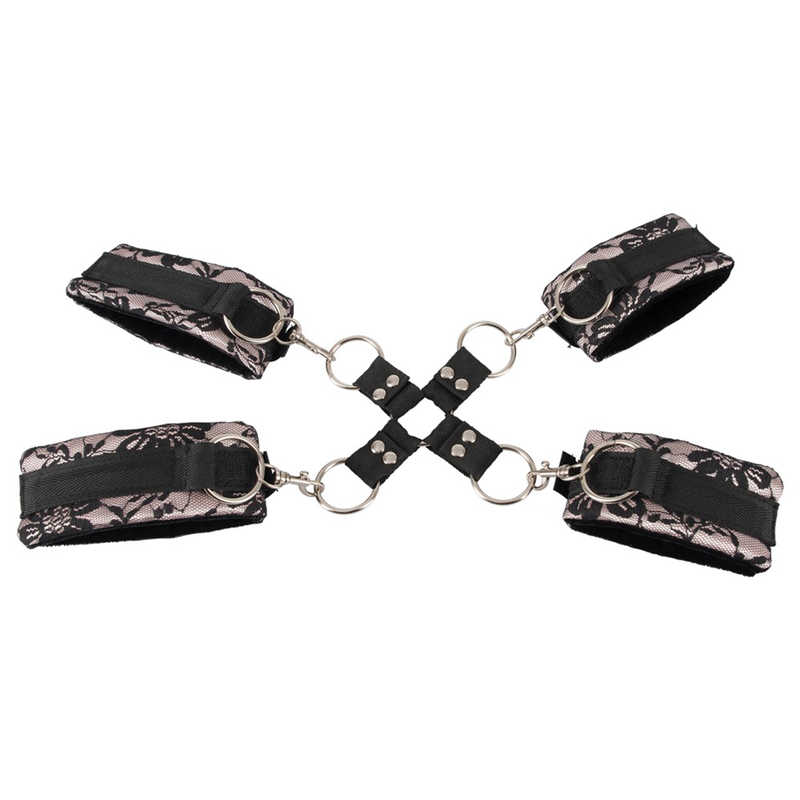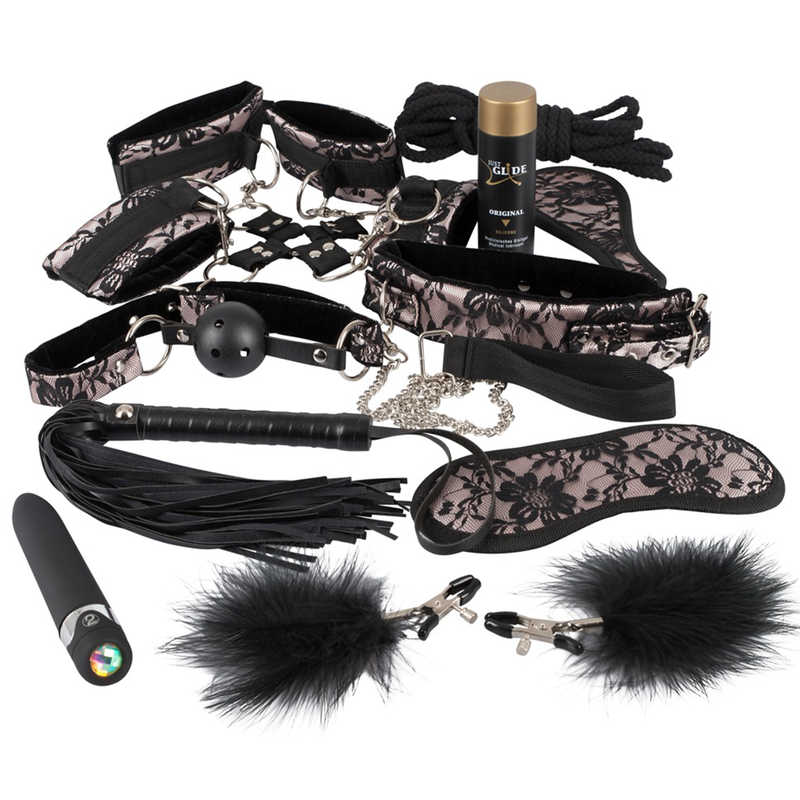 - Комплектация кандалы для рук и ног с крестоообразным соединителем, ошейник с поводком, маска, шлепалка, кляп, плетка, зажимы на соски, веревка, вибратор в картонной коробке