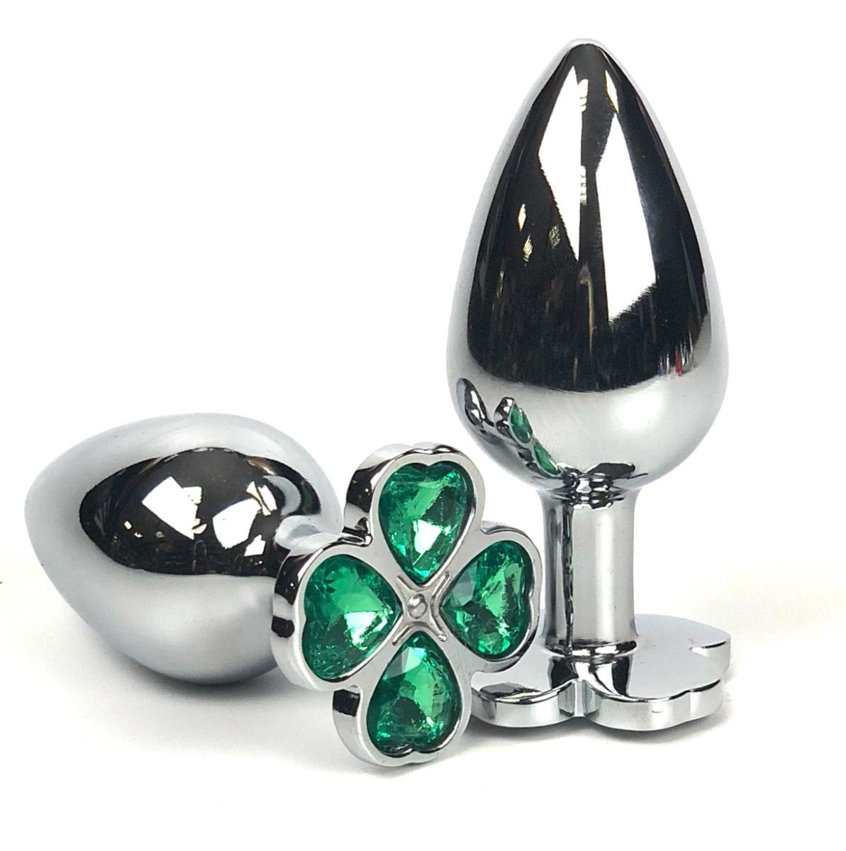 - Модель Серебристая анальная втулка с клевером из зеленых кристаллов - 9 см.