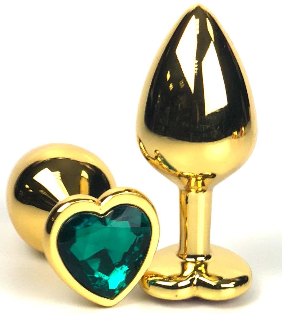 - Модель Золотистая анальная пробка с зеленым кристаллом-сердцем - 8 см.