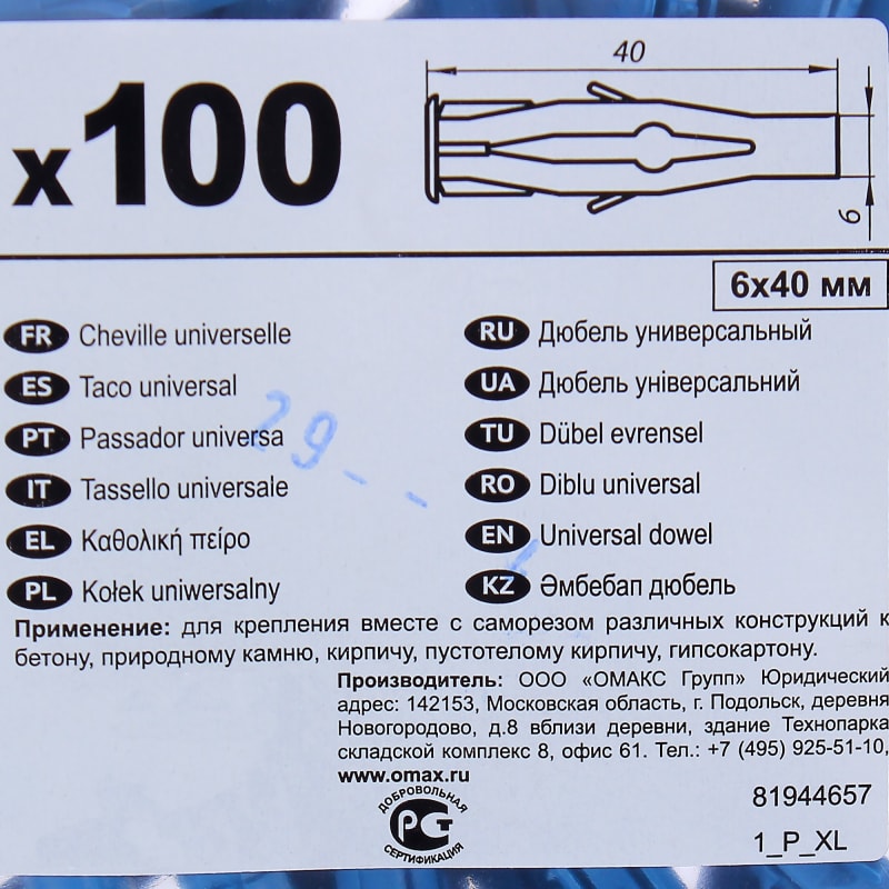 Дюбель 6x40 мм, полипропилен, 100 шт.