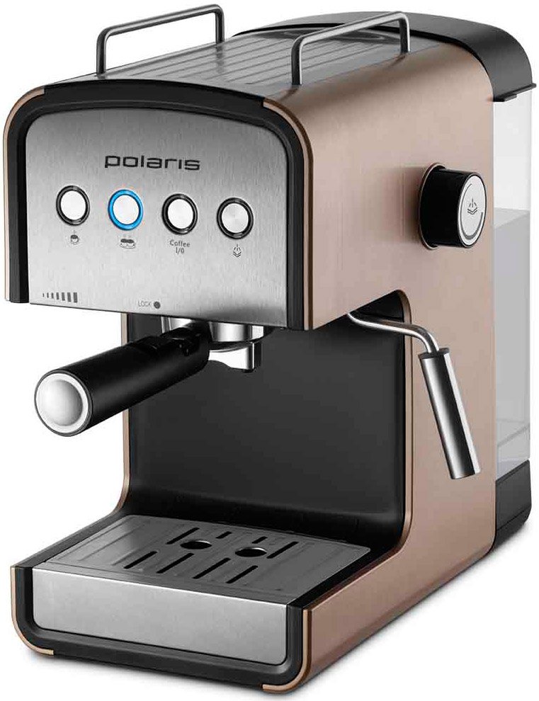 Кофеварка рожковая (эспрессо), тип кофе: молотый, мощность 850 Вт, давление помпы 15 бар, регулировка: размера порции, функции: дозировка на 2 чашки, капучинатор.