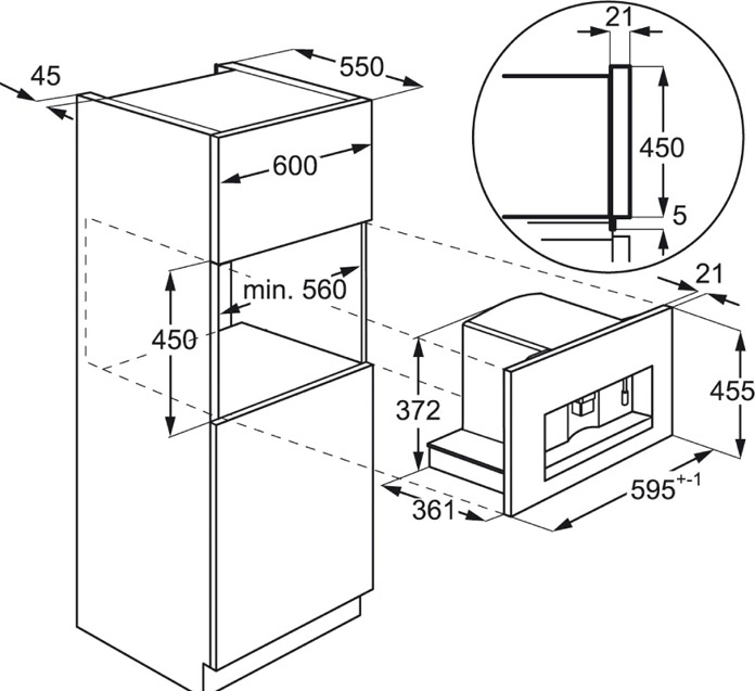 Встраиваемая кофемашина, тип кофе: зерно, молотый, мощность 1350 Вт, давление помпы 15 бар, объем контейнера для кофе 200 г, кофейник стеклянный, регулировка: крепости кофе, температуры кофе, помола, размера порции, функции: капучинатор, подогрев платформы для чашек, подсветка зоны приготовления.