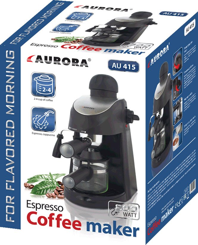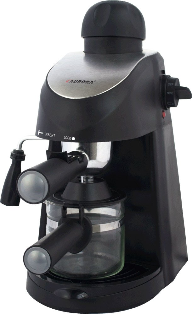 Кофеварка рожковая (эспрессо), тип кофе: молотый, мощность 800 Вт, давление помпы 4 бар, кофейник стеклянный, функции: капучинатор.