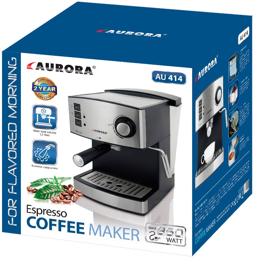 Кофеварка рожковая (эспрессо), тип кофе: молотый, мощность 850 Вт, давление помпы 15 бар, функции: подогрев платформы для чашек, дозировка на 2 чашки, капучинатор.