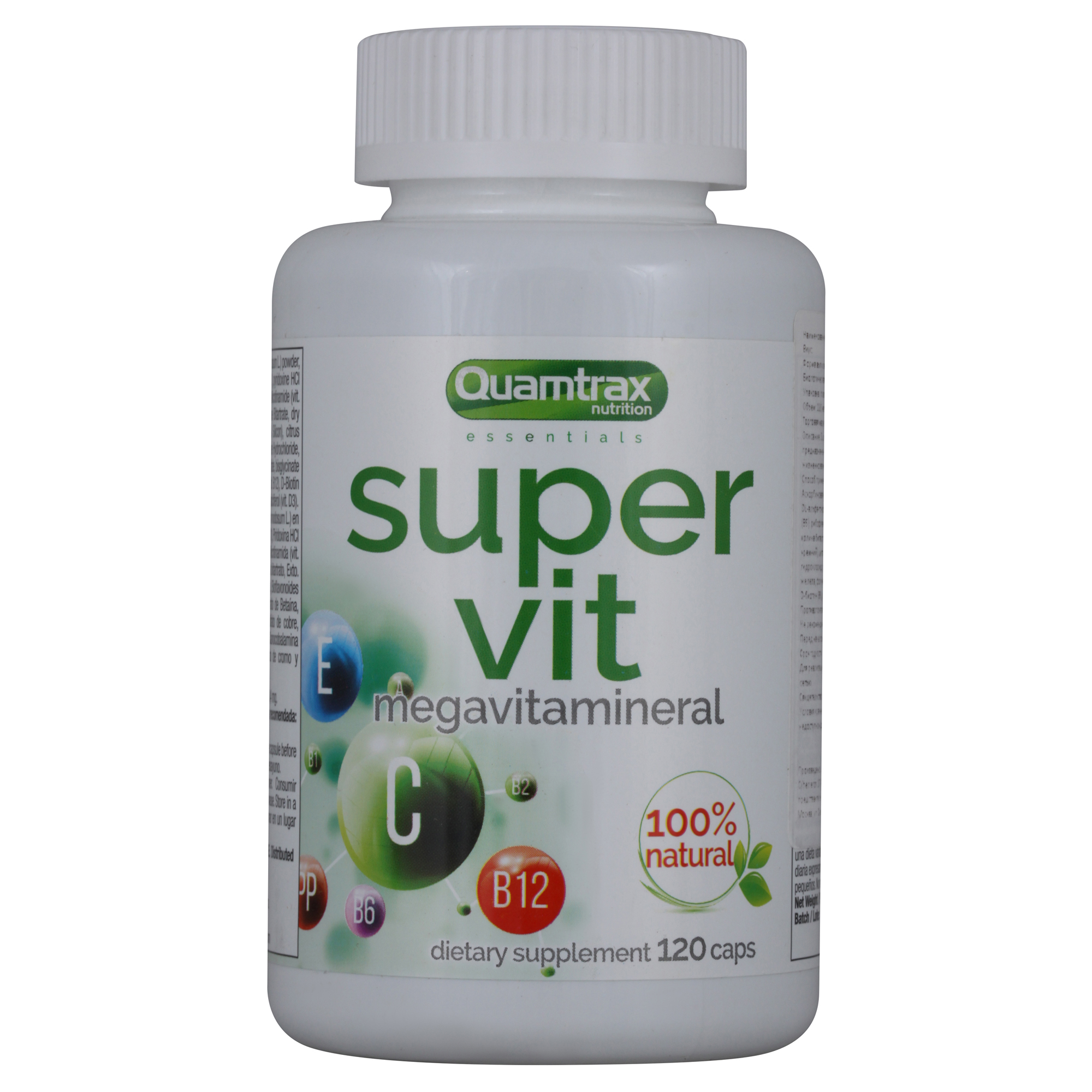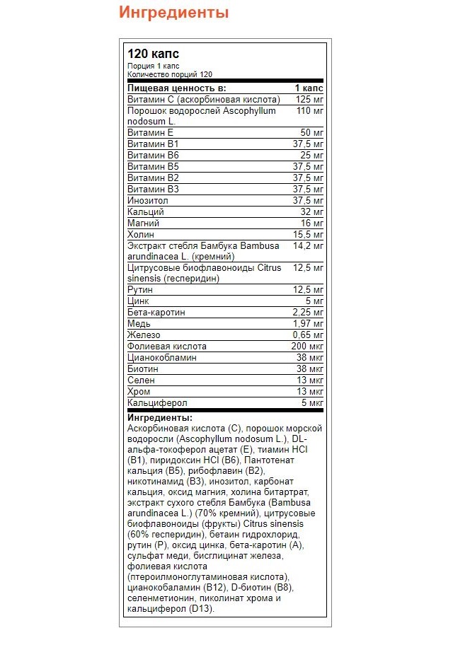 - Прочие ингредиенты, в порции Аскорбиновая кислота (С), порошок морской водоросли (Ascophyllum nodosum L.), DL-альфа-токоферол ацетат (Е), тиамин HCl (В1), пиридоксин HCl (В6), Пантотенат кальция (В5), рибофлавин (В2), никотинамид (В3), инозитол, карбонат кальция, оксид магния, холина битартрат, экстракт сухого стебля Бамбука (Bambusa arundinacea L.) (70% кремний), цитрусовые биофлавоноиды (фрукты) Citrus sinensis (60% гесперидин), бетаин гидрохлорид, рутин (Р), оксид цинка, бета-каротин (А), сульфат меди, бисглицинат железа, фолиевая кислота (птероилмоноглутаминовая кислота), цианокобаламин (В12), D-биотин (В8), селенметионин, пиколинат хрома и кальциферол (D13).