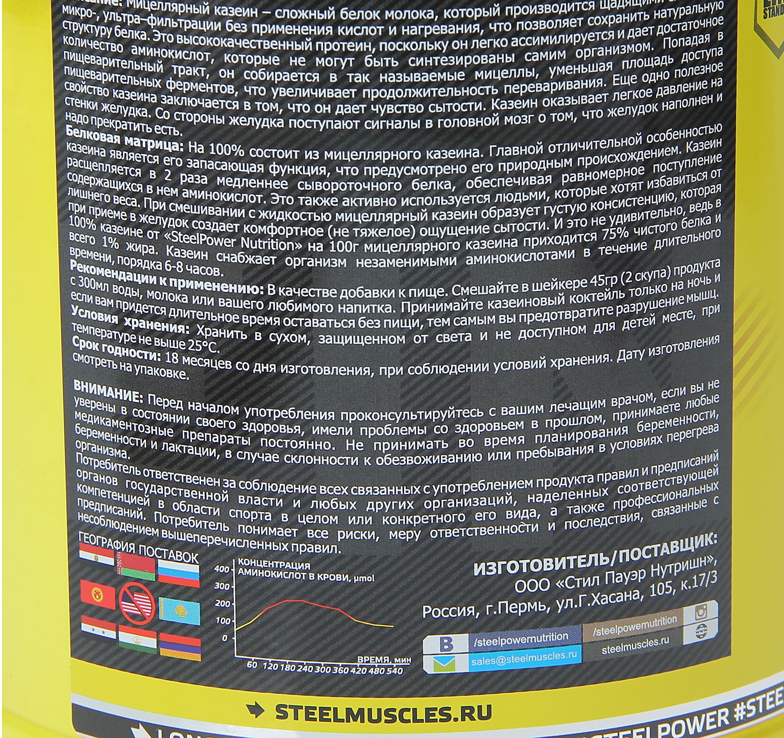 - Действующие вещества, в порции концентрат молочного белка (мицеллярный казеин)