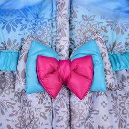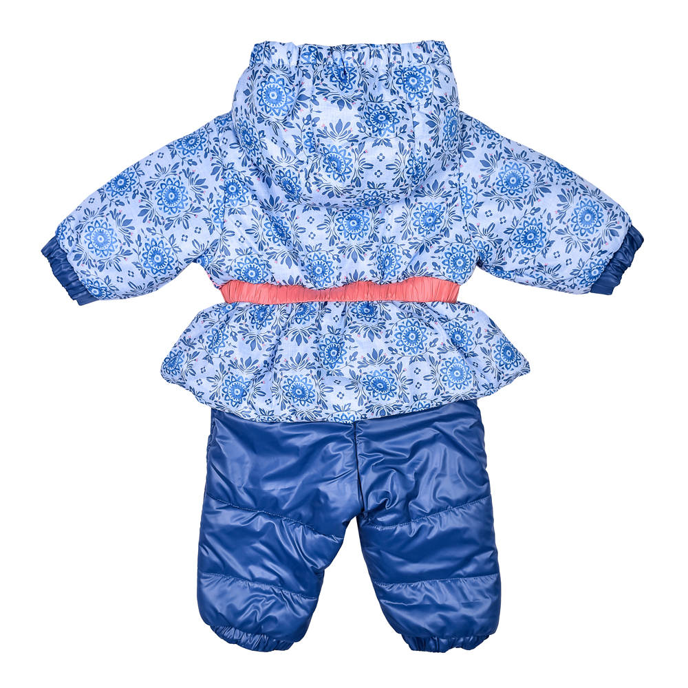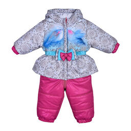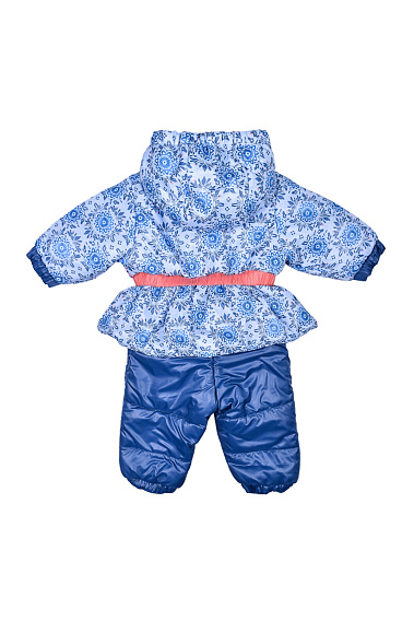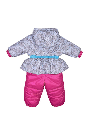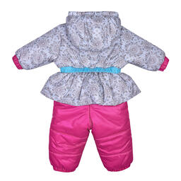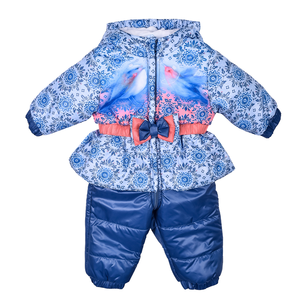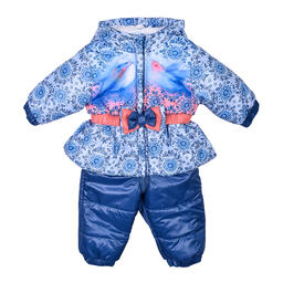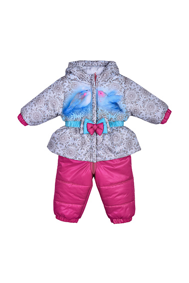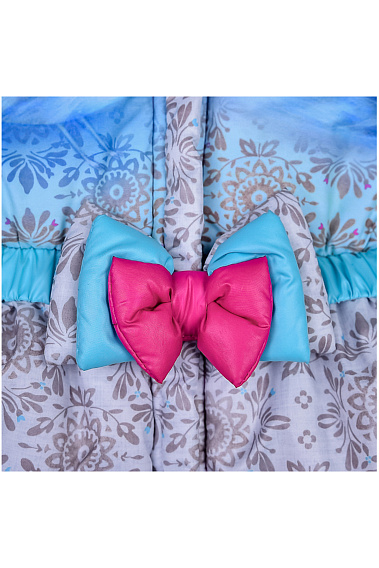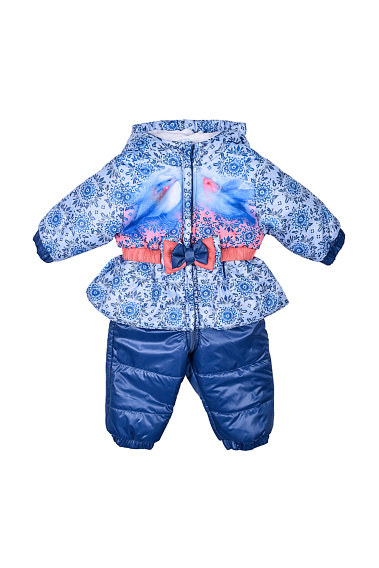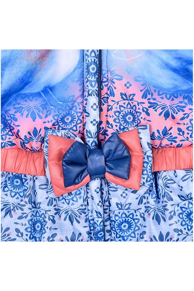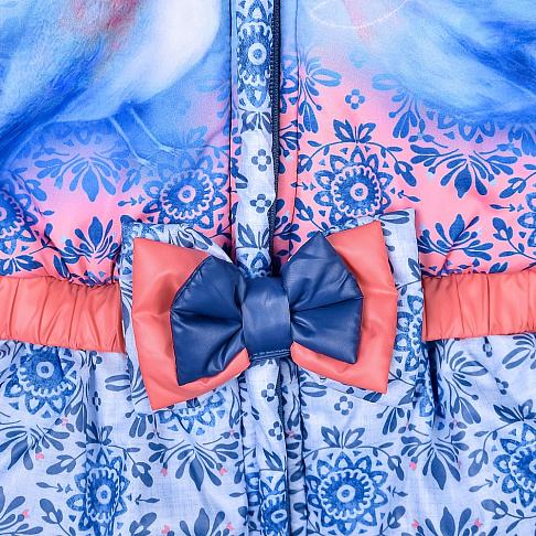 Утепленный комбинезон с ярким принтом и декоративным бантиком на поясе. Комбинезон застегивается на молнию, которая защищена двойной планкой от продувания.