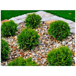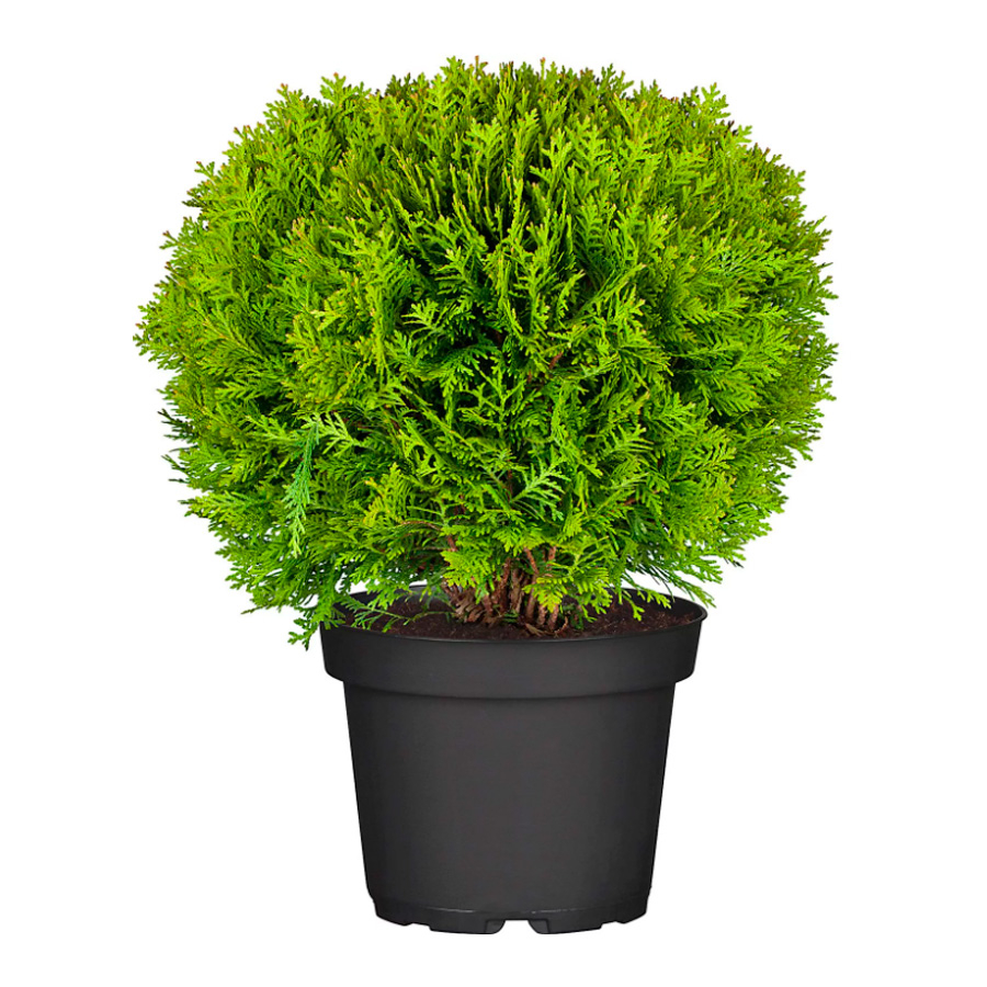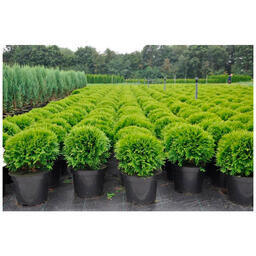 Самая популярная в мире шаровидная туя. Достигает высоты 0,6-0,8м, диаметра кроны 1м. Вечнозеленый карликовый кустарник с округлой, плотной, шаровидной кроной. В сравнении с большинством шаровидных туй выигрывает пестротой окраски хвои на протяжении всего года.