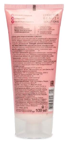 - Активные вещества экстракт йогурта; экстракт клубники; масло авокадо