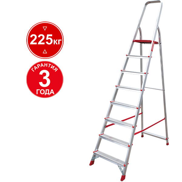 Широкие рифлёные ступени обеспечивают уверенное сцепление обуви с поверхностью, снижая риск скольжения. Жёсткие соединения сохраняют устойчивость даже при длительной нагрузке, а верхняя площадка расширяет возможности, позволяя разместить инструменты или использовать её как рабочую поверхность. Отсутствие поручней делает конструкцию более компактной при хранении и транспортировке, что удобно для перемещений между объектами. Лёгкий вес лестницы упрощает переноску, при этом она сохраняет жёсткость и долговечность.