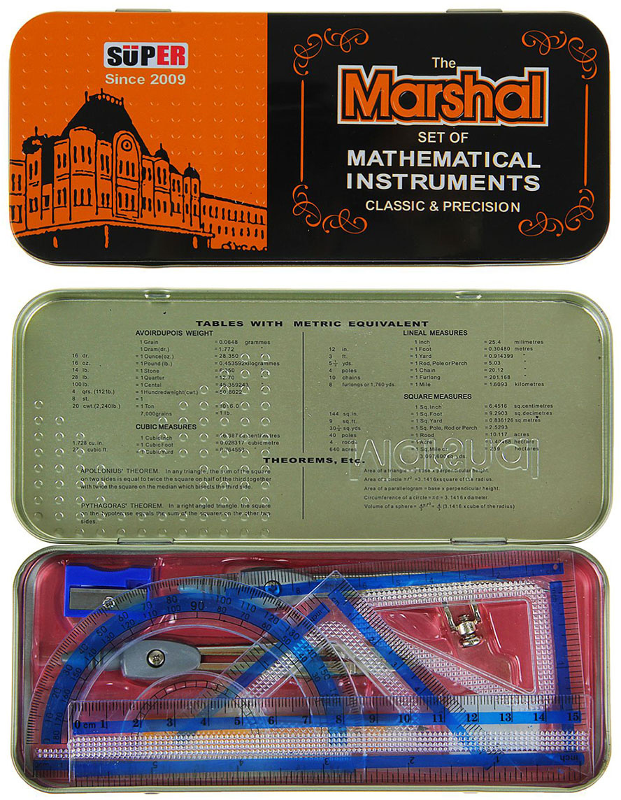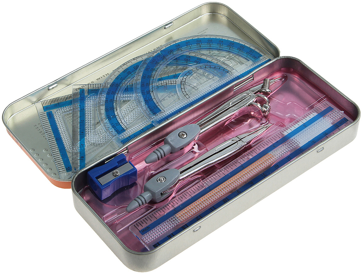 - Состав набора Карандаш, Точилка, Ластик, Линейка, Треугольник, Циркуль