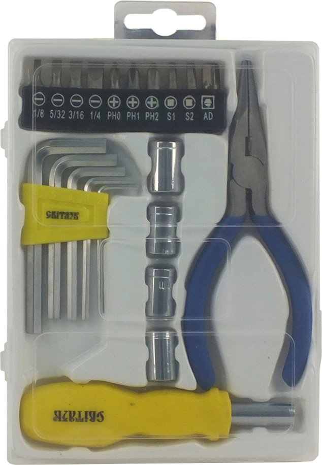 - Комплектация - Биты, 10 шт.; - Г-подобные ключи HEX, 5 шт.; - торцевые головки удлиненные 1/4": 6, 7, 8, 9, 4 шт.; - мини длиногубцы; - битодержатель; - пластиковый футляр