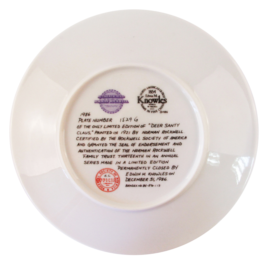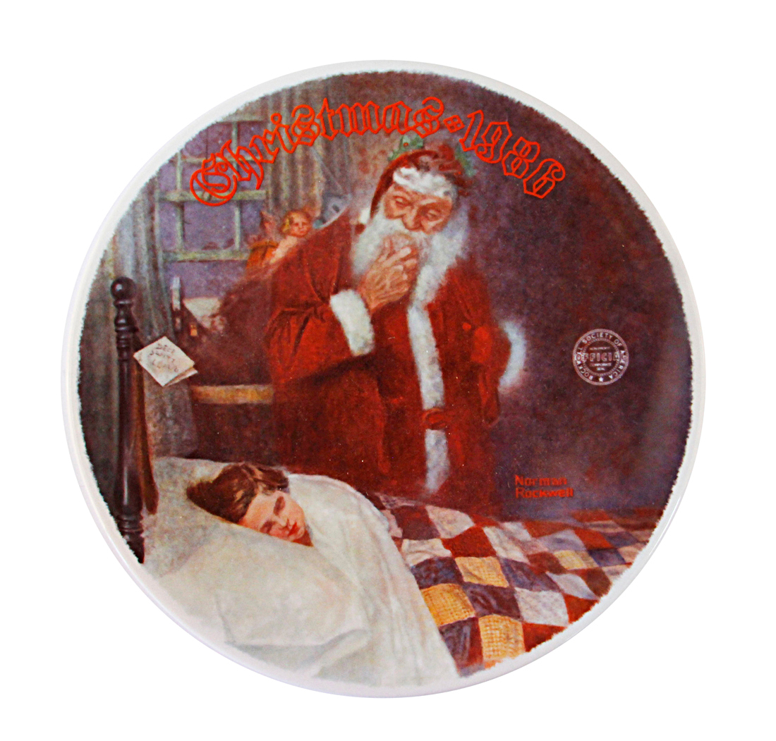 Декоративная коллекционная тарелка "Новогодняя серия: Рождество 1984 - Санта Клаус". Фарфор, деколь, золото. США, Edwin M.Knowles, Норман Роквелл, 1984.