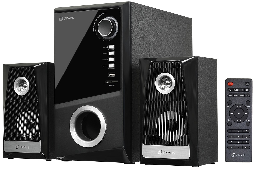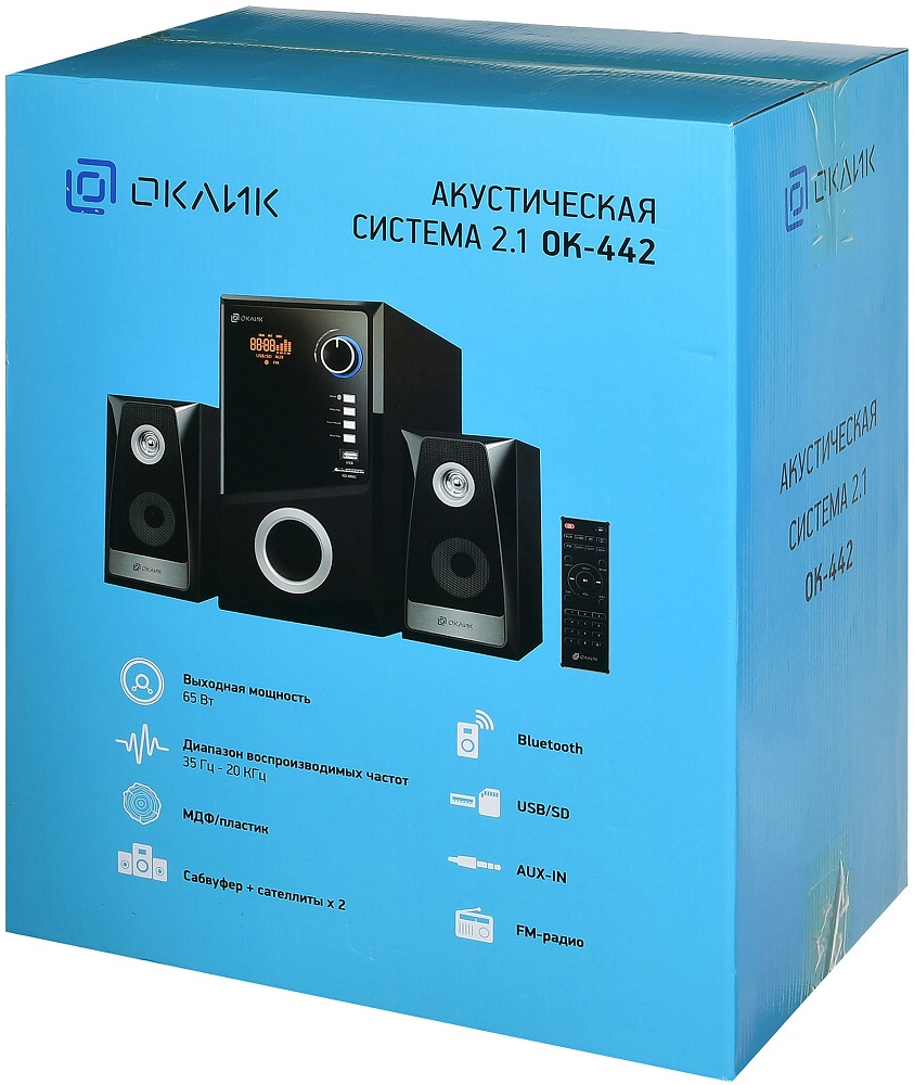 2.1, 65 Вт, нижняя частота 35 Гц, верхняя частота 20000 Гц, 65 дБ, FM-тюнер , карты памяти, uSB Flash (флешки), пульт управления, питание: от сети.