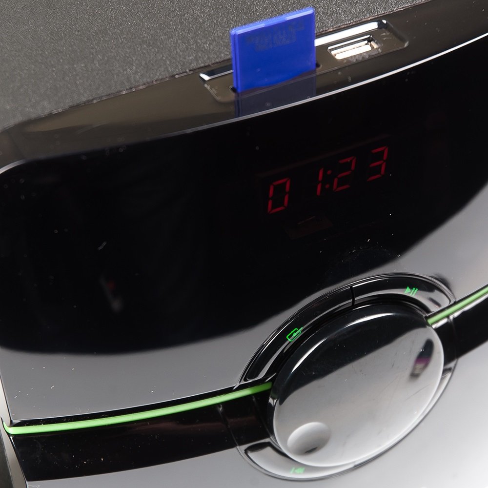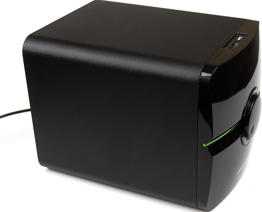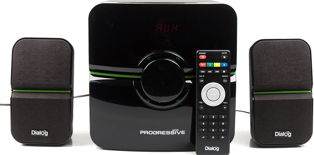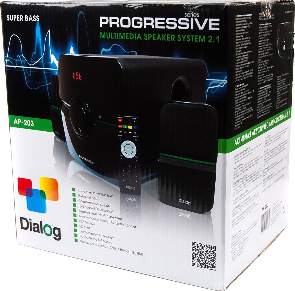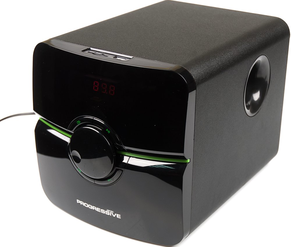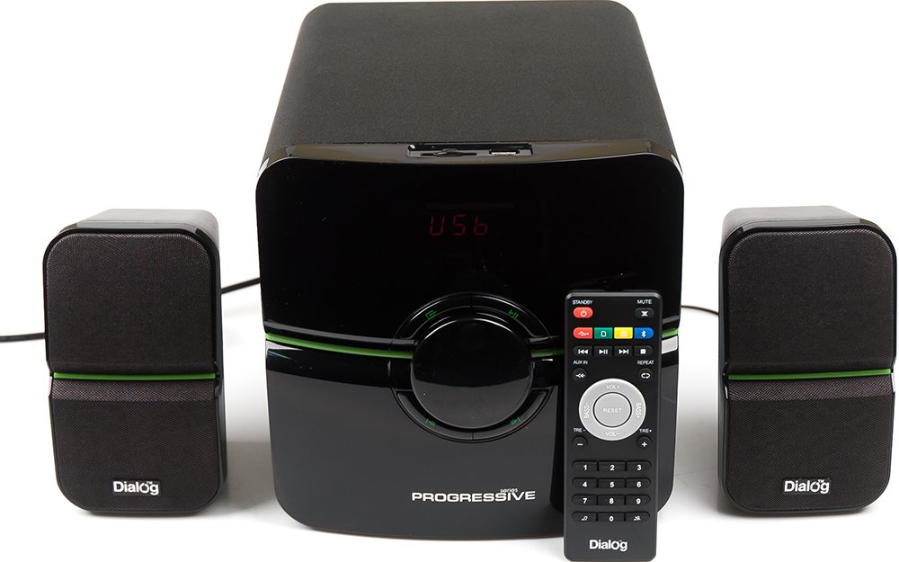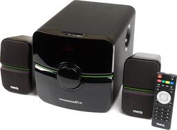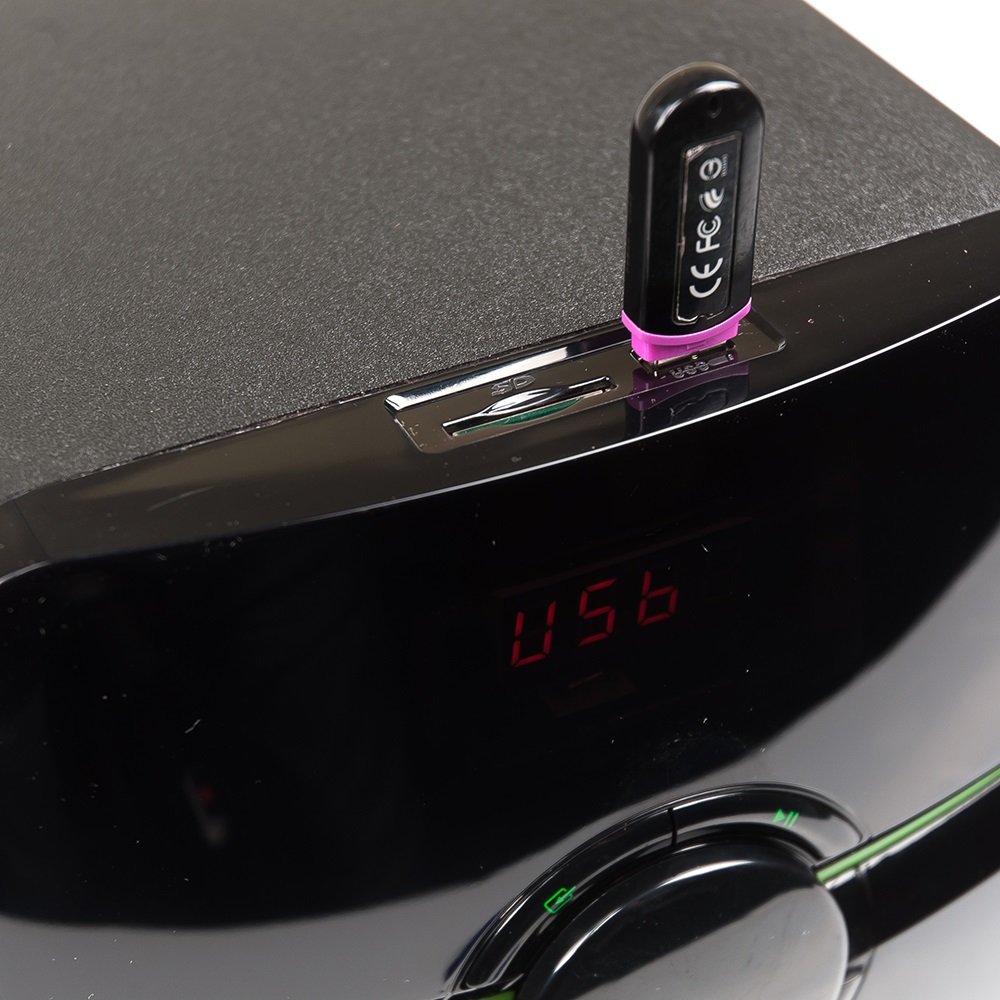 2.1, 38 Вт, нижняя частота 40 Гц, верхняя частота 20000 Гц, 80 дБ, FM-тюнер , карты памяти, uSB Flash (флешки), пульт управления, питание: от сети.