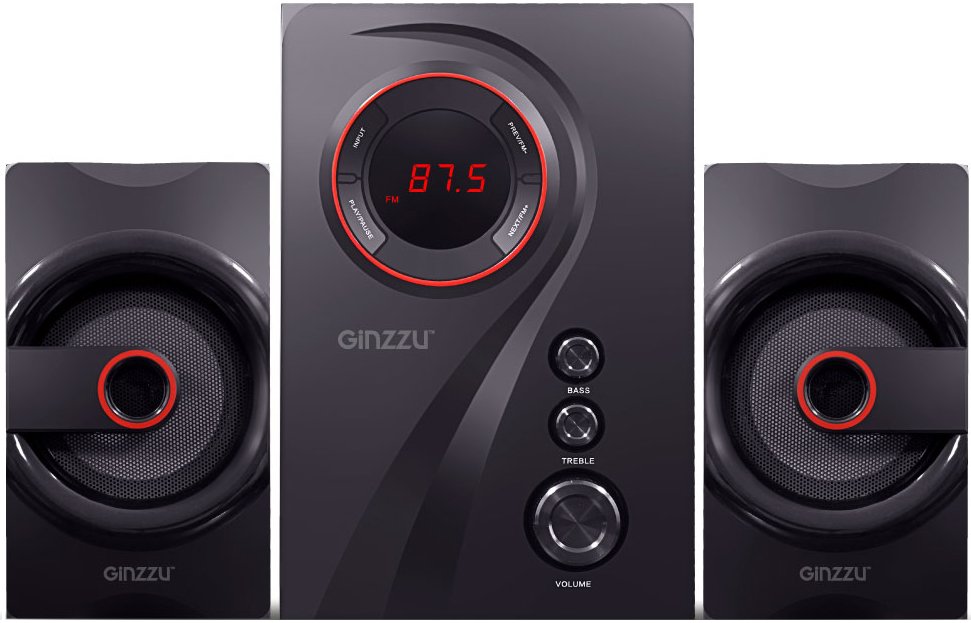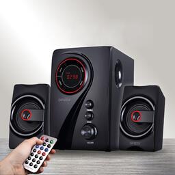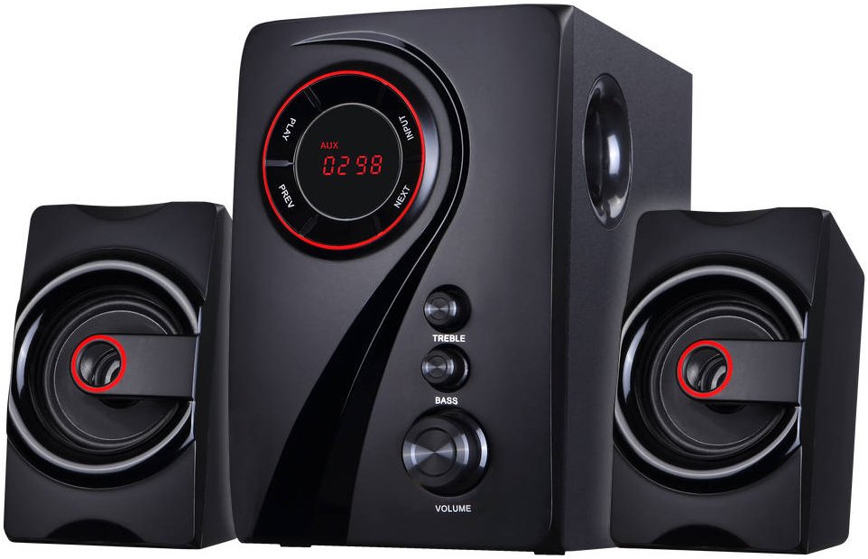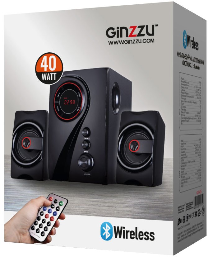 2.1, 40 Вт, нижняя частота 40 Гц, верхняя частота 20000 Гц, 68 дБ, регулировка вЧ, нЧ, FM-тюнер , uSB Flash (флешки), карты памяти, пульт управления, питание: от сети.