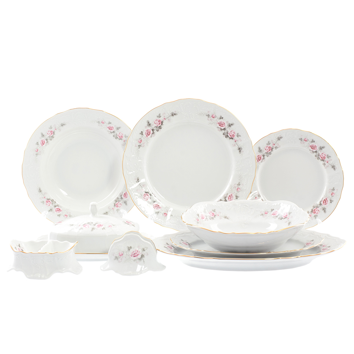 - Состав набора тарелка подстановочная 29 см - 6 шт; тарелка суповая 23 см- 6 шт; тарелка десертная 19 см - 6 шт; блюдо овальное 36х24 - 1 шт; блюдо 24х18 см - 1 шт; солонка ,перечница 100мл - 2 шт; салатник 24 см - 1 шт; пиала 250 мл.