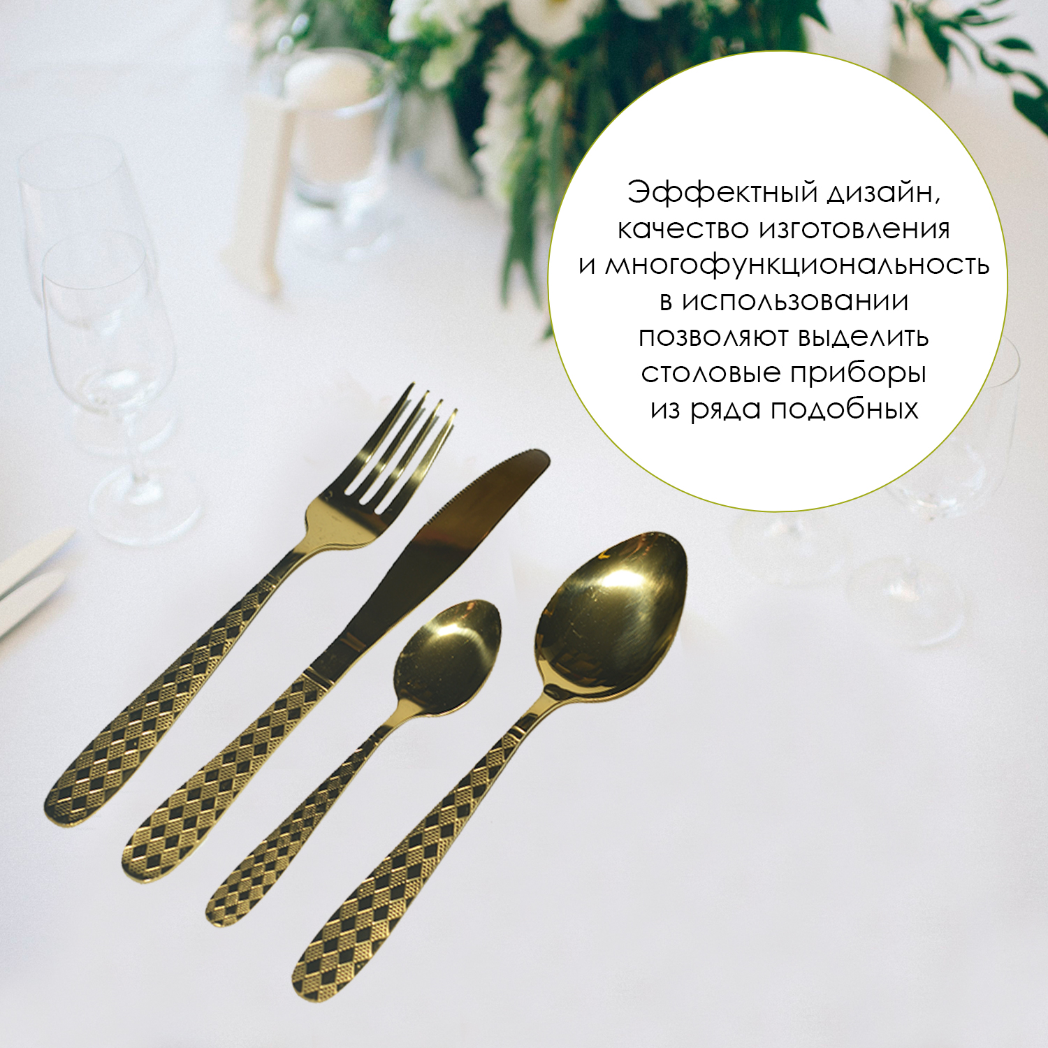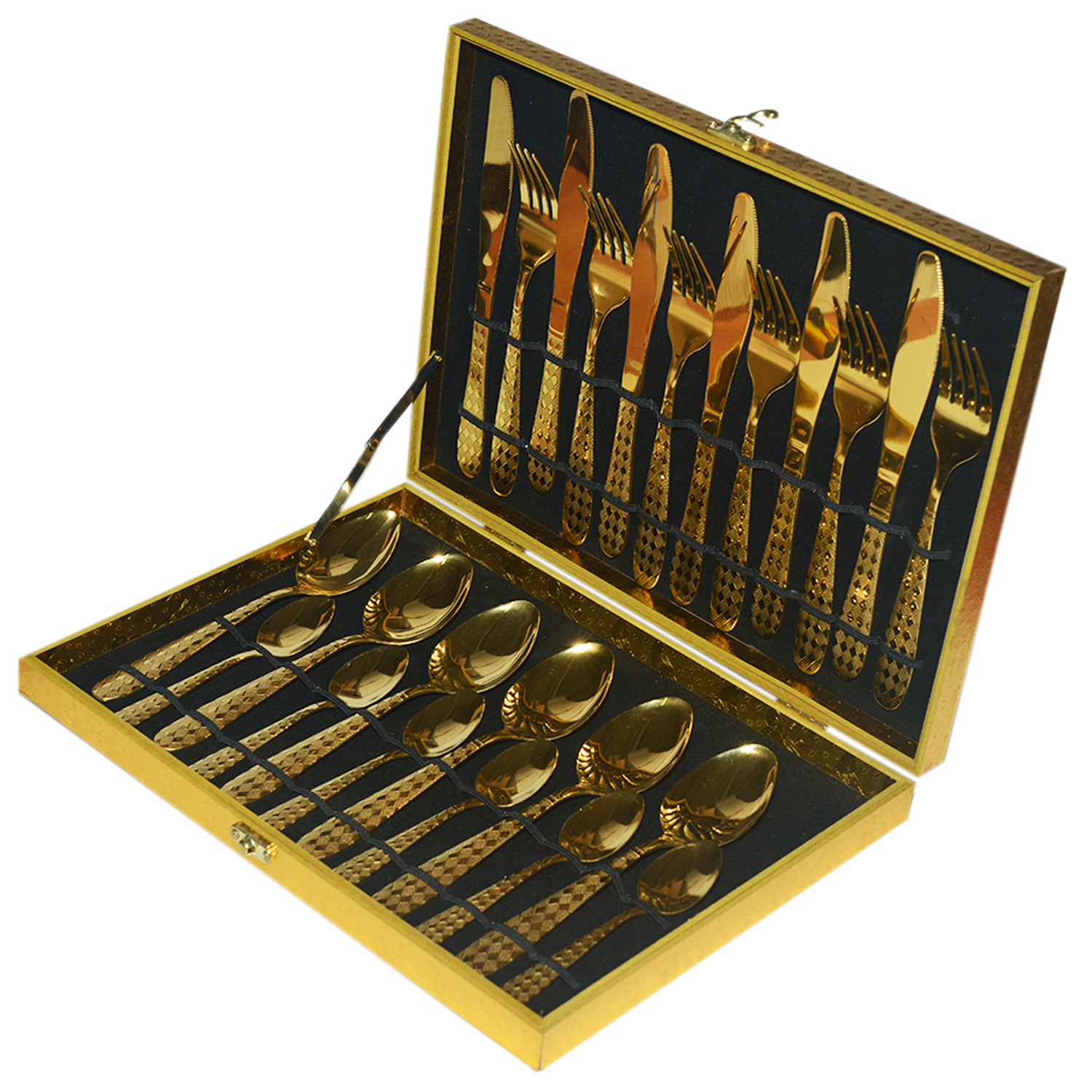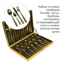 - Состав набора шесть вилок, шесть ложек, шесть столовых ножей и шесть десертных ложек, подарочный металлический кейс